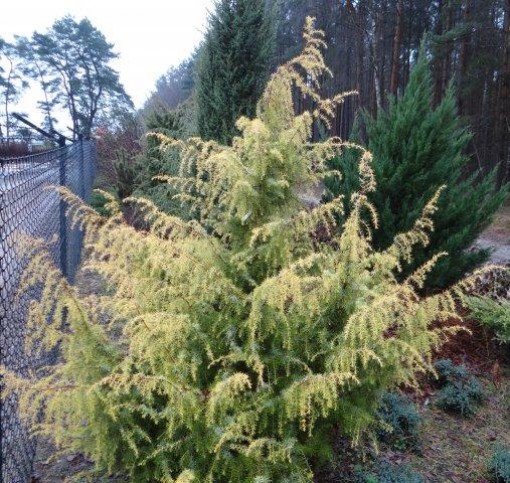 Liście rośliny są szpilkowate, po trzy w okółku, oddalone od siebie, prosto odstające, sztywne, kłujące, do 30 mm długości i 2 mm szerokości. Igły zwykle są szarozielone, z wierzchu z szeroką białą wstęgą środkową i wąskimi zielonymi smugami brzeżnymi. Kwiaty są rozdzielnopłciowe, rozmieszczone dwupiennie. Pojawiają się jesienią w pachwinach liści okółków w środkowej części gałązek. Kwiaty męskie są małe, podłużne, żółte, zwykle skierowane skośnie w dół, składają się z licznych okółków o 3 łuskowatych pręcikach. Kwiaty żeńskie są bardzo małe i niepozorne, zielonkawe, prosto wzniesione, składające się z licznych 3- członowych okółków o podłużnie spiczastych listkach łuskowych. Trzy zalążki są umieszczone szczytowo pomiędzy trzema najwyższymi łuskowatymi listkami. Łuski kwiatów żeńskich po zapyleniu zrastają się w jedną i mięsistą szyszkojagodę otaczającą 3 nasiona. Niedojrzałe szyszkojagody są zielonkawe, wielkości grochu i nieprzyjemne w smaku. Dojrzewają dopiero jesienią drugiego lub trzeciego roku. Mają ok. 1 cm średnicy, są czarnobrunatne, niebieskawo oszronione, na krótkich trzoneczkach. Nasiona słabo 3-kanciaste, jasnobrunatne, z twardą łupiną.