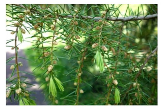 Gałązki drobne długie, wiotkie, brązowożółte. Igły smukłe długości od 1,5 do 2,5 cm przy 1 mm szerokości, sztywne, kłujące, ułożone luźno po 3 wokół pędów i gałązek, odstające. Od spodu igły ostro wypukłe, błyszczące, zielone od góry wklęsłe z wąskim paskiem niebieskobiałego woskowego nalotu. Szyszki męskie i żeńskie zwykle na oddzielnych osobnikach. Idealny także na Bonsai.
