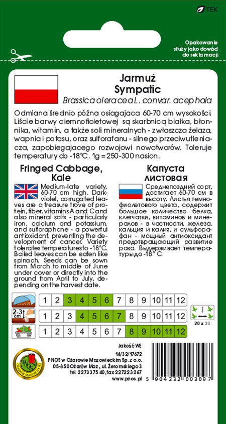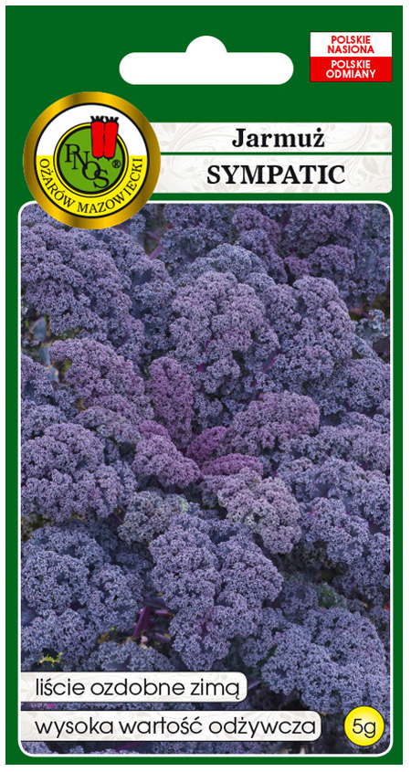 Jarmuż czerwony Sympatic to odmiana średnio późna. Odmiana osiągająca 60-70cm wysokości. Liście barwy ciemnofioletowej są skarbnicą białka, błonnika, witamin, a także soli mineralnych - zwłaszcza żelaza, wapnia i potasu oraz sulforafanu - silnego przeciwutleniacza, zapobiegającego rozwojowi nowotworów. Toleruje temperatury do -18°C.