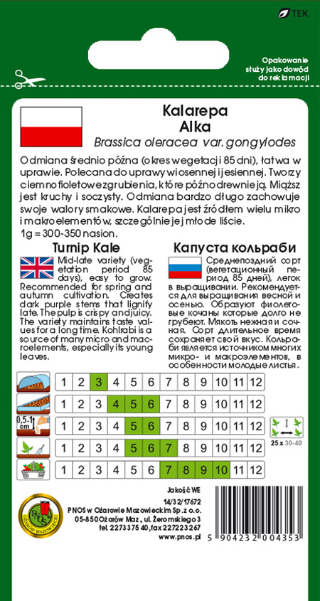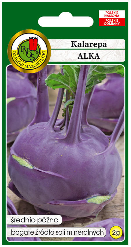 Kalarepa Alka to odmiana średnio późna. Kalarepa łatwa w uprawie. Polecana do uprawy wiosennej i jesiennej. Tworzy ciemnofioletowe zgrubienia, które późno drewnieją. Miąższ jest kruchy i soczysty. Odmiana bardzo długo zachowuje swoje walory smakowe. Kalarepa jest źródłem wielu mikro i makroelementów, szczególnie jej młode liście. Okres wegetacji 85 dni.