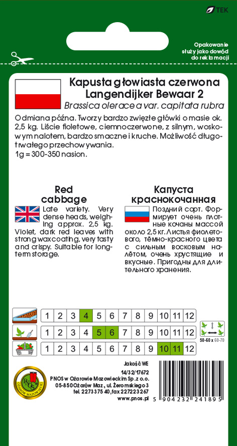 Kapusta czerwona Langedijker to odmiana późna. Główki kuliste, lekko wydłużone o masie 2-4 kg, bardzo zwięzłe. Liście ciemnoczerwono-fioletowe z silnym woskowym nalotem, bardzo smaczne i kruche. Idealna do bezpośredniego spożycia. Polecana również do długotrwałego przechowywania. Wymaga silnego nawożenia i podlewania.
