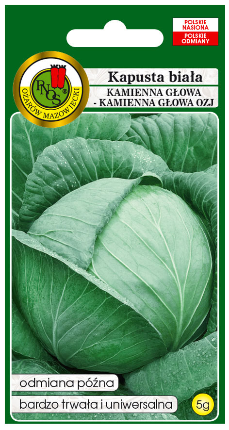 Kapusta głowiasta biała Kamien Głowa to odmiana późna, (okres wegetacji 130 do 150 dni). Charakteryzuje się dość dużymi główkami, które mogą osiągać od 3,5 do 4,5kg. Wykształca duże, białe liście wewnętrzne, a okalające ją liście zewnętrzne są barwy zielonej. Główki zazwyczaj mają kulisty lub lekko spłaszczony kształt, są bardzo ścisłe. Odmiana wyróżnia się dosyć wysokim głąbem, który może mieć od 18 do 25cm wysokości. Kamienna Głowa jest jedną z najbardziej plennych odmian kapusty białej w Polsce, jest to też najlepsza odmiana do kwaszenia. Dobrze smakuje też spożywana bezpośrednio, na surowo lub gotowana. Nie ma szczególnie dużych wymagań glebowych, ale na bardziej żyznym podłożu daje duży, stabilny plon. Bywa wrażliwa na niedobór wody, w suchych latach wymaga podlewania. Nie ma tendencji do pękania, wyróżnia się także niezwykłą trwałością w przechowywaniu.
