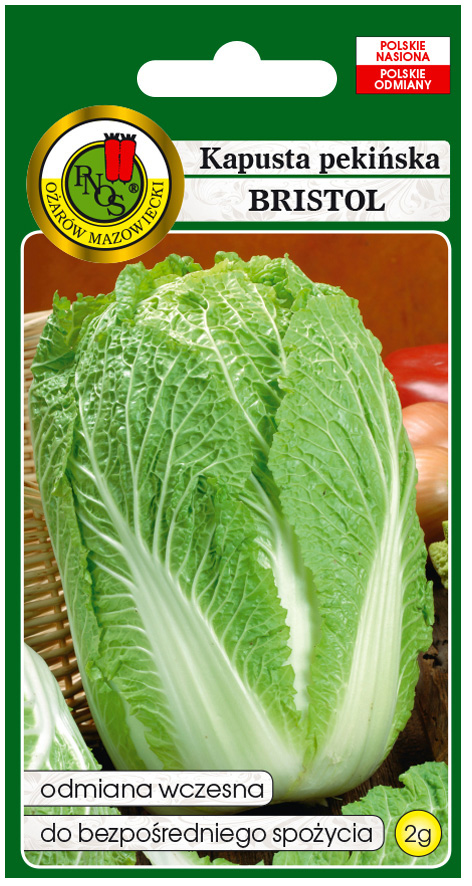 Kapusta pekińska Bristol to odmiana wczesna Czas od wysadzenia do zbioru 55-65 dni, polecana do uprawy jesiennej. Główki eliptyczne, średniej wielkości, o masie 1,5-2kg. Liście żółto-zielone, bardzo smaczne. Odmiana z wysoką odpornością na wybijanie w pędy nasienne. Wysiew od połowy czerwca najlepiej do doniczek, multiplatów, aby nie naruszyć systemu korzeniowego przy wysadzaniu rozsady w pole.