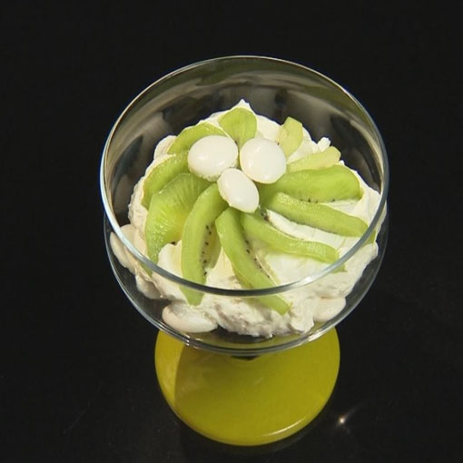 SKŁADNIKI : 250 ml śmietany 30% 250 g sera mascarpone 1 szklanka cukru pudru 7 kiwi 1 łyżka cukru 1 białko Szczypta soli
