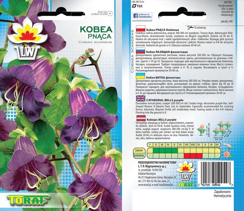 Ozdobna roślina jednoroczna, pnącze 200-300cm wysokości. Tworzy duże, dekoracyjne fioletowo-liliowe, dzwonkowate kwiaty, osadzone na długich szypułkach.