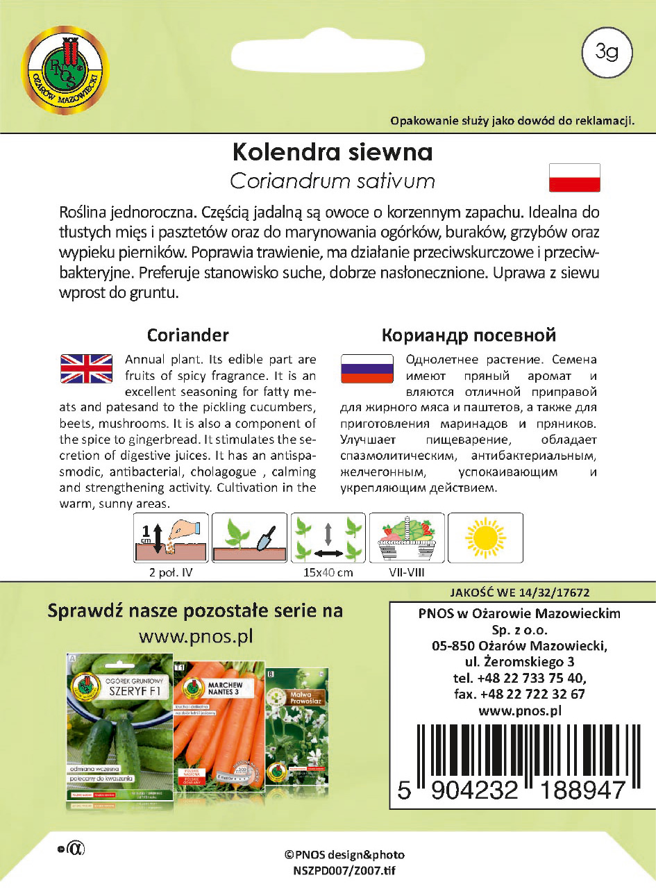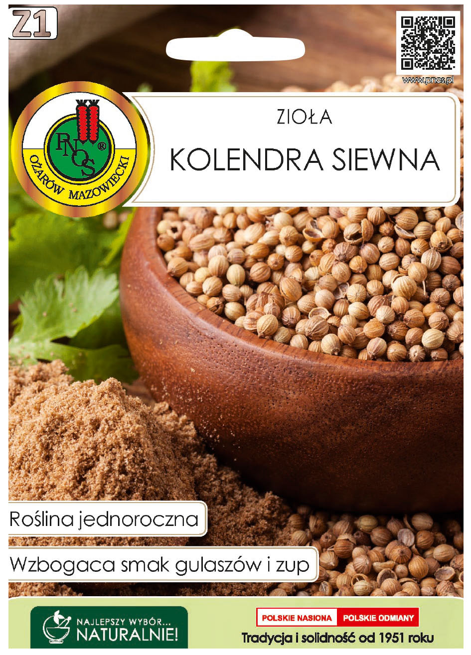 Kolendra siewna jest jednorocznym, silnie aromatycznym ziołem osiągającym wysokość 30 – 90cm. Częścią jadalną są jej owoce o korzennym zapachu. Idealna do tłustych mięs i pasztetów oraz do marynowania ogórków, buraków, grzybów. Jest także składnikiem przyprawy do pierników. Poprawia trawienie. Ma działanie przeciwskurczowe, przeciwbakteryjne, żółciopędne i uspokajające. Kolendra siewna preferuje lekkie, żyzne gleby. Zioło toleruje pH od 4.9 do 8.2. Kolendra siewna jest odporna na chłód i upał. Wymaga miejsca bardzo słonecznego i częstego podlewania w czasie suszy. Kolendrę siewną należy sadzić w miejscach osłoniętych od wiatru. Kolendra siewna nie lubi być przesadzana. Nasiona sadzić wiosną po ostatnich przymrozkach, na głębokość 0,5-1 cm. Młode roślinki zwykle zaczynają się pojawiać po 10-20 dniach, należy je rozsadzić tak, aby odległość pomiędzy roślinami wyniosła około 15 cm.