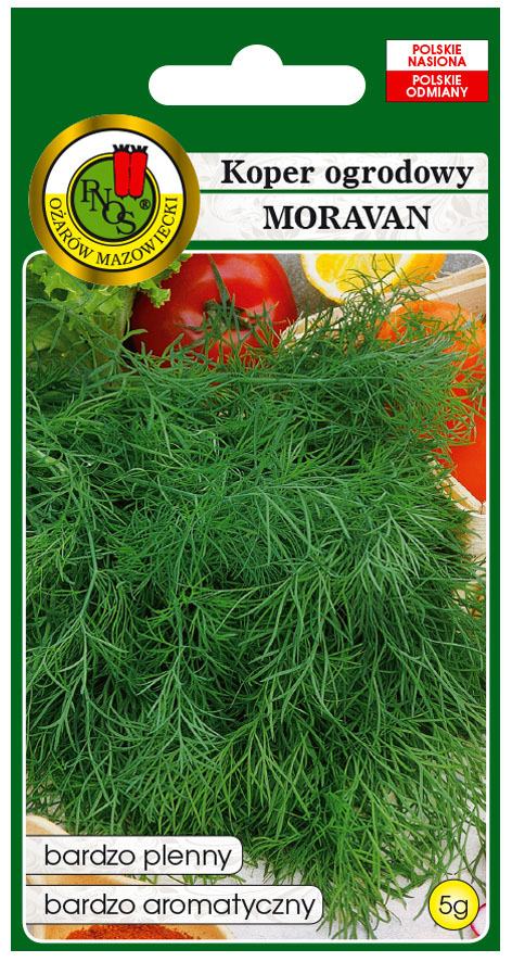 Koper ogrodowy Moravan to odmiana wczesna. Roślina o ciemnozielonej barwie liści i silnym aromacie. Rośliny dorastają do 90-110cm, dobrze się krzewią i późno zakwitają. Bardzo dobra do zbioru na zielono. Daje bardzo wysoki plon. Doskonała odmiana do suszenia i mrożenia.