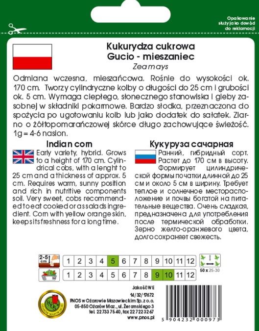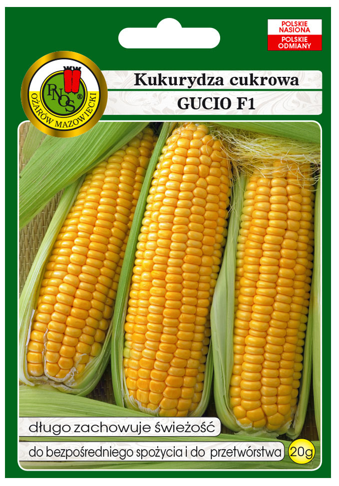 Kukurydz cukrowa Gucio to odmiana wczesna. Mieszaniec F1, bardzo słodki. Rośliny wysokie ok. 170cm, tworzą cylindryczne kolby długości do 25 cm i grubości ok.5 cm. Wymaga gleby zasobnej w składniki pokarmowe oraz ciepłego słonecznego stanowiska. Przeznaczona do spożycia po ugotowaniu kolb lub jako dodatek do sałatek.