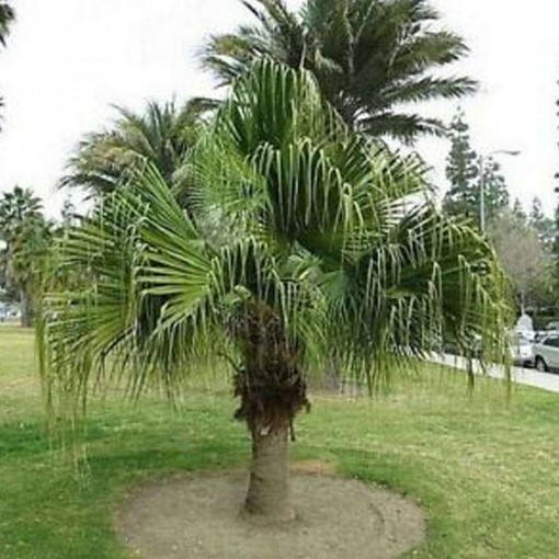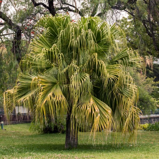 Jej niezwykle oryginalne liście, przypominające parasole są naprawdę duże. Mogą dorastać do 50-90 cm. długości i ok. 40 cm. szerokości. Są zielone i mają kształt zrośniętych ze sobą podłużnych, cienkich liści, których końce zwisają luźno, tworząc charakterystyczne „pazurki”. Parasolowate, półokrągłe liście wyrastają na końcach długich, sztywnych ogonków (pokrytych niewielkimi kolcami), które z kolei u podstawy łączą się z chropowatym pniakiem, nazywanym u palm „kłodziną”. Całość wygląda bardzo malowniczo, przywodząc na myśl gorące, nadmorskie plaże w egzotycznych krajach. Ze względu na kształt liści, roślina bywa również nazywana chińską palmą wachlarzową.