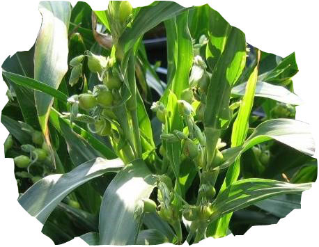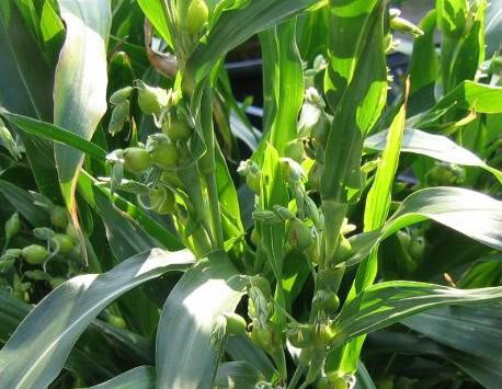 Roślina o sztywnych pędach osiąga do 60 cm wysokości, liście szablaste, załamujące się w połowie, zwisające w dół. Latem rośliny tworzą zwisające wiechowate kwiatostany złożone z licznych drobnych żółtych kwiatów. Po przekwitnieniu ukazują się duże zielone nasiona o kształcie i wielkości spadających kropli wody, które po dojrzeniu, przybierają barwę białą lub czarno-siną.