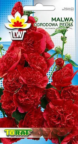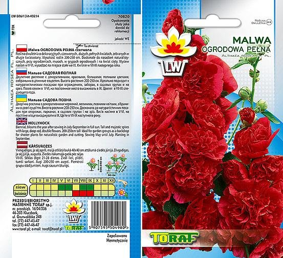 Roślina dwuletnia o dekoracyjnych, czerwonych , dużych, pełnych kwiatach, zebranych w długie kwiatostany. Wysokość roślin 200-250cm.