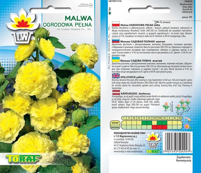 Roślina dwuletnia o dekoracyjnych, żółtych, dużych, pełnych kwiatach, zebranych w długie kwiatostany. Wysokość roślin 200-250cm.