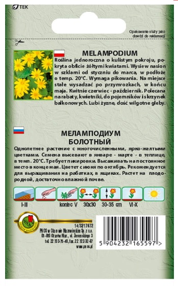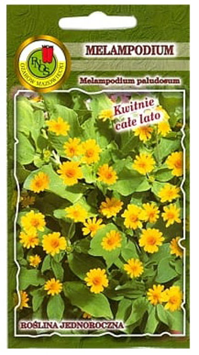 Melampodium żółte to mocno rozkrzewiona roślina o zwartym, kulistym pokroju. Liście jasnozielone, osadzone gęsto na łodygach. Kwiaty złotożółte, pokrywające roślinę przez całe lato. Jest to roślina polecana w szczególności na balkony, tarasy, ogródki skalne, murki ozdobne, skarpy, świetnie czuje się również przy skupiskach wodnych. Nasiona wysiewamy do pojemników od lutego do kwietnia na miejsce stałe można sadzonki wysadzać w maju.