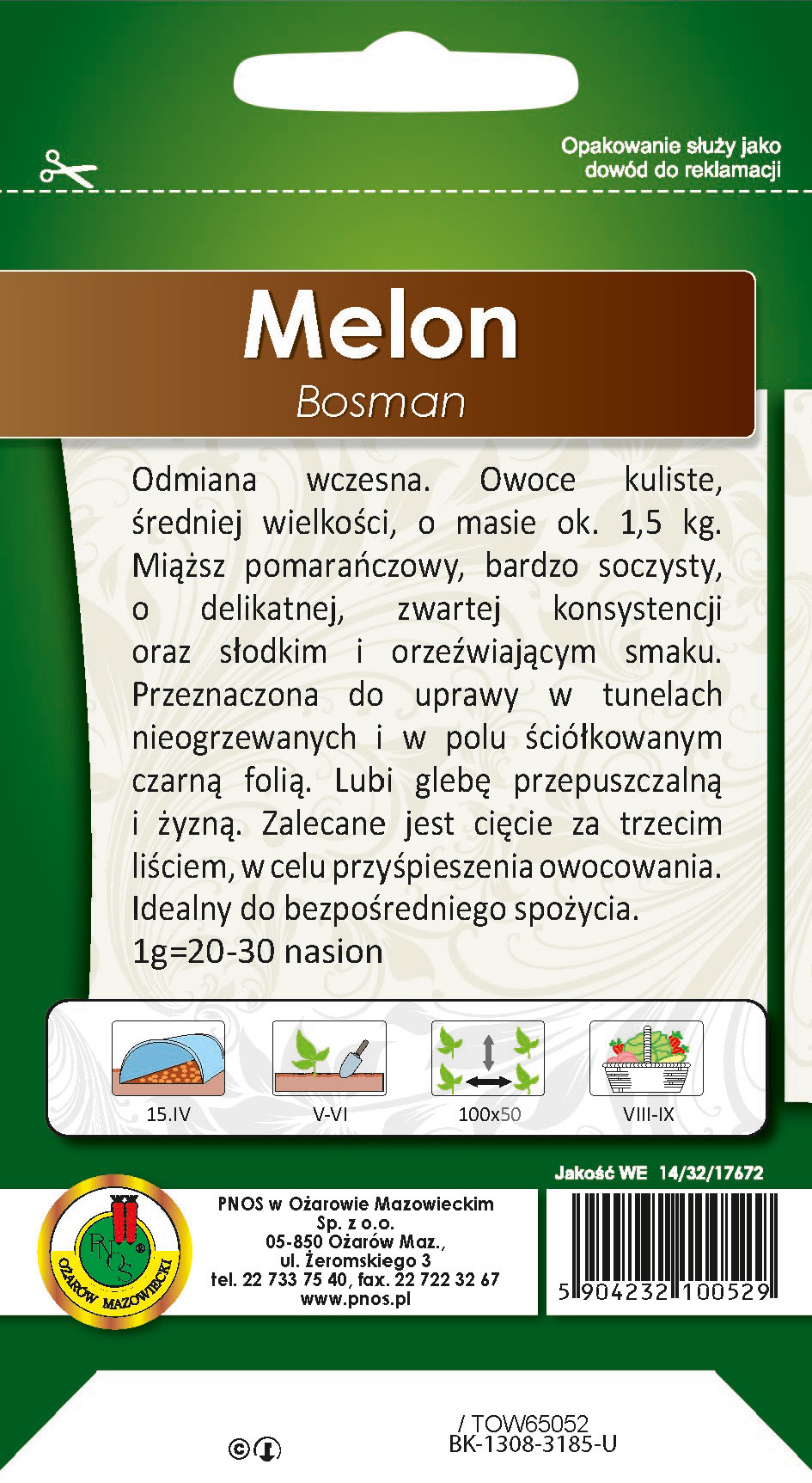 Melon Bosman to odmiana wczesna (wcześniejsza od odm. Oliwin i Melba) do uprawy pod nieogrzewanymi osłonami. Owoce kuliste, średniej wielkości, o masie ok. 1,5 kg. Miąższ pomarańczowy, bardzo soczysty, o delikatnej, zwartej konsystencji, słodki. Najwyższe plony uzyskuje się przy podporach. Odmiana nadaje się również do uprawy w polu na osłoniętym terenie. Wskazane jest cięcie za trzecim liściem, ponieważ zabieg ten przyspiesza owocowanie.