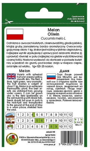 Melon Oliwin to odmiana wczesna. Odmiana wcześniejsza od 'Melby', do uprawy pod osłonami lub w polu ściółkowanym folią. Tolerancyjna wobec chłodów, plenna. Rośliny średniej wielkości o kilku pędach bocznych. Owoce kuliste z kremowo-żółtą, gładką skórką o masie około 1 kg. Miąższ jasnozielony, gruby, masłowy, delikatny, aromatyczny. Odmiana doskonała do bezpośredniego spożycia. Plon owoców 2-3 kg/m2 pod osłonami, 15-20 t/ha przy ściółkowaniu.
