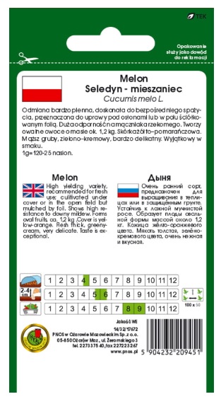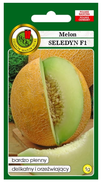 Melon Seledyn to odmiana bardzo wczesna. Odmiana przystosowana do uprawy w polu i uprawy pod osłonami. Rośliny o bujnym wzroście i wysokiej tolerancji wobec mączniaka rzekomego. Owoce kształtu owalno-kulistego, o masie 1,0-1,4 kg. Skórka owocu dojrzałego żółto-pomarańczowa z zanikającą zieloną barwą i bardzo delikatną siatką na pierwszych owocach. Miąższ gruby, seledynowo-kremowy, bardzo soczysty, o doskonałym smaku i aromacie. Doskonała do bezpośredniego spożycia. Plon owoców przy uprawie z rozsady i ściółkowaniu czarną folią wynosi 35-40 t/ha.
