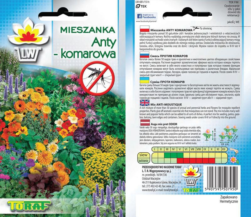 Bogata mieszanka ponad 50 gatunków ziół i kwiatów jednorocznych i wieloletnich o właściwościach odstraszających komary. Rośliny wydzielają aromatyczne olejki eteryczne których komary nie znoszą. W skład mieszanki wchodzi wiele znanych i lubianych ziół które oprócz funkcji odstręczającej komary mogą pełnić funkcji użytkową jako dodatek do różnego rodzaju potraw.
