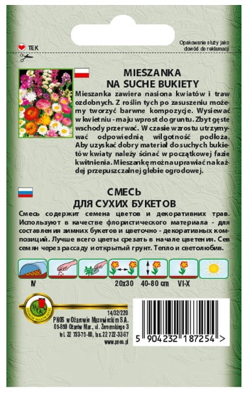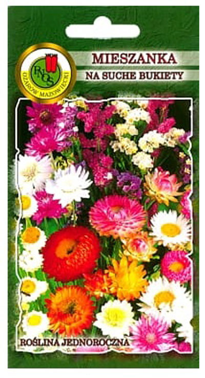 Mieszanka na suche bukiety to mieszanka różnobarwnych kwiatów i traw przeznaczonych do tworzenia suchych kompozycji. Kwiaty należy ścinać w początkowej fazie kwitnienia.