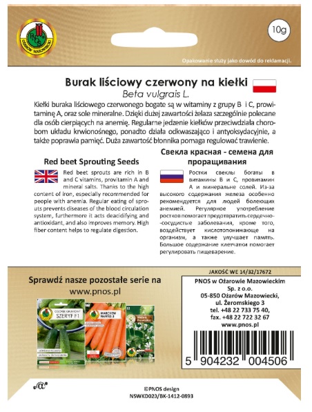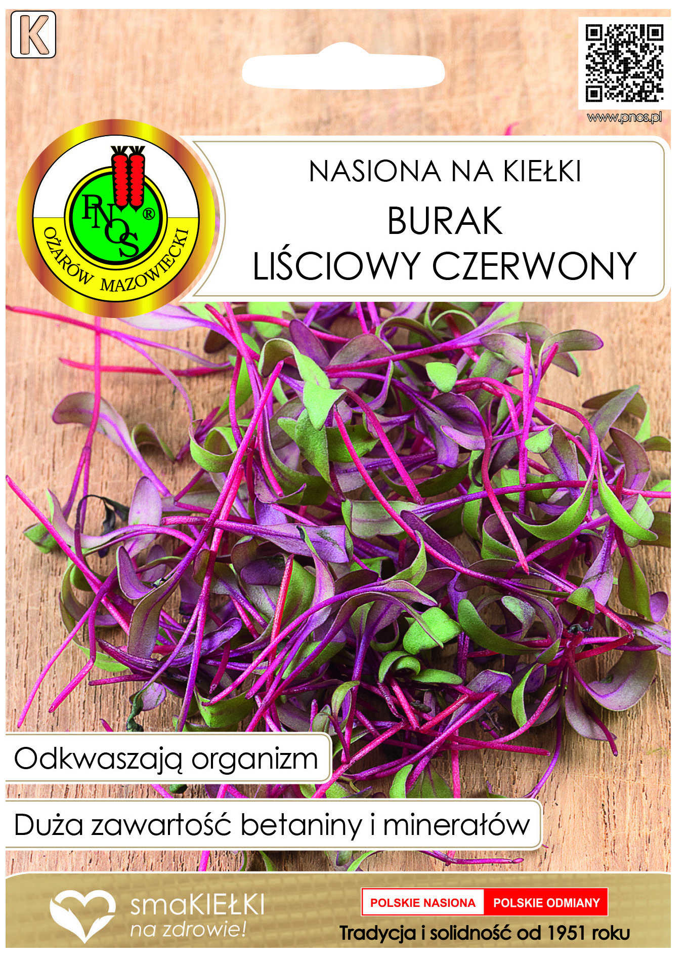 Nasiona na kiełki burak liściowy czerwony. Kiełki buraka liściowego czerwonego bogate są w witaminy z grupy B i C, prowitaminę A, oraz sole mineralne. Dzięki dużej zawartości żelaza szczególnie polecane dla osób cierpiących na anemię. Regularne jedzenie kiełków przeciwdziała chorobom układu krwionośnego, ponadto działa odkwaszająco i antyoksydacyjnie, a także poprawia pamięć. Duża zawartość błonnika pomaga regulować trawienie.