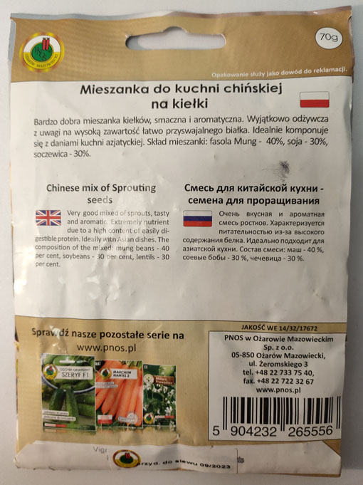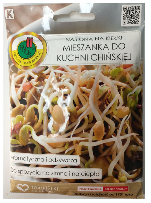 Nasiona na kiełki Mieszanka do kuchni chińskiej na kiełki to bardzo dobra mieszanka kiełków, smaczna i aromatyczna. Wyjątkowo odżywcza z uwagi na wysoką zawartość łatwo przyswajalnego białka. Idealnie komponuje się z daniami kuchni azjatyckiej. Skład mieszanki: fasola Mung - 40%, soja - 30%, soczewica - 30%.