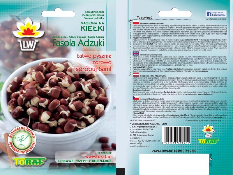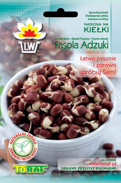 Fasola adzuki podobna jest w smaku do fasoli mung. Jej czerwono-brązowe nasiona cenione są za swoje prozdrowotne i odchudzające właściwości. Kiełki fasoli adzuki leczą dolegliwości związane z infekcjami pęcherza moczowego oraz chronią przed niedokrwistością. Jej kiełki są bardzo smaczne, chrupiące o lekko słodkim orzechowym posmaku.