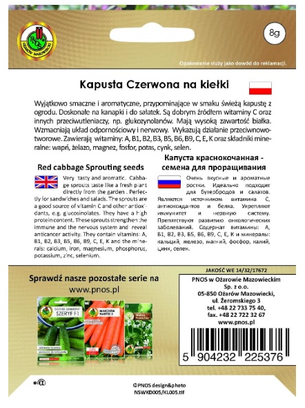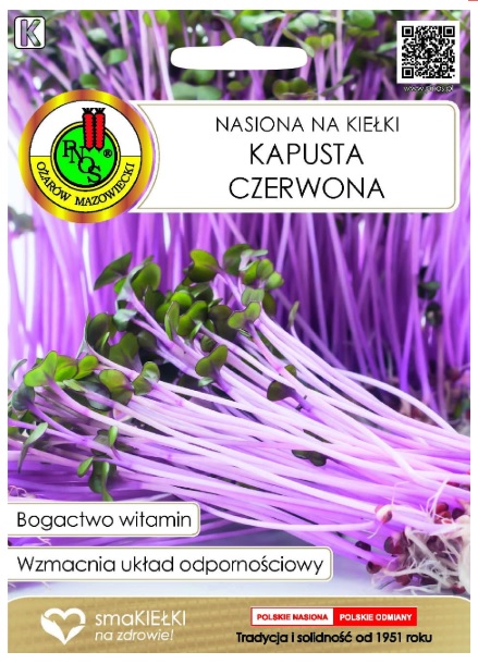 Nasiona na kiełki Kapusta Czerwona. Wyjątkowo smaczne i aromatyczne. Bogate źródło witaminy C oraz innych przeciwutleniaczy. Mają wysoką zawartość białka, zawierają witaminy: A, B1, B2, B3, B5, B6, B9, C, E, K oraz składniki mineralne: wapń, żelazo, magnez, fosfor, potas, cynk, selen.