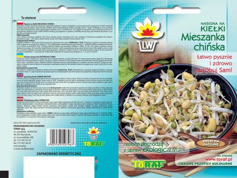 Mieszanka chińska skomponowana jest z gatunków znajdujących zastosowanie w potrawach kuchni azjatyckiej. Kiełki świetnie smakują przyrządzone na patelni z niewielką ilością oleju, jako samodzielne danie lub dodatek do potraw.
