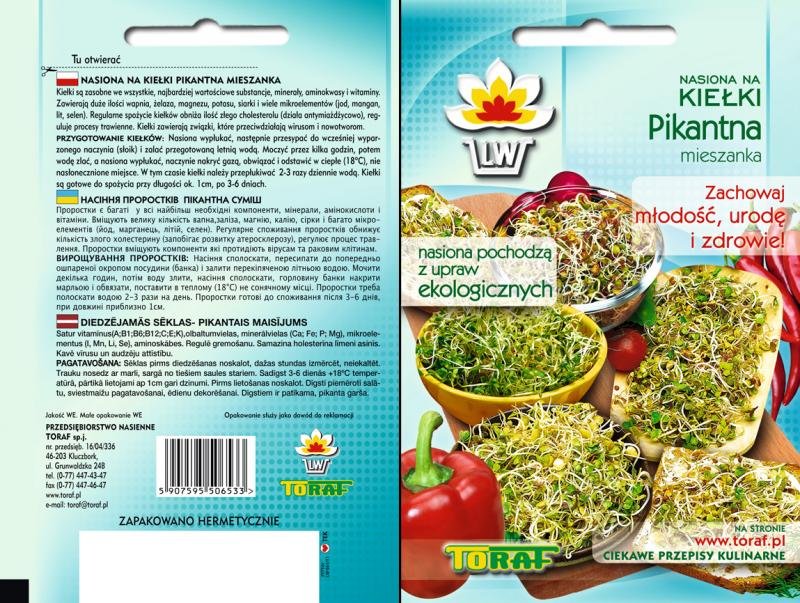 Mieszanka nasion na kiełki składająca się z gatunków tworzących pikantna kompozycje smakowa. Dzięki różnorodności gatunków wchodzących w skład tej mieszanki zyskujemy w jednej porcji duża dawkę wartościowych substancji odżywczych, soli mineralnych, aminokwasów i witamin.