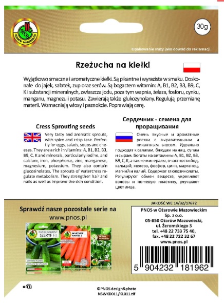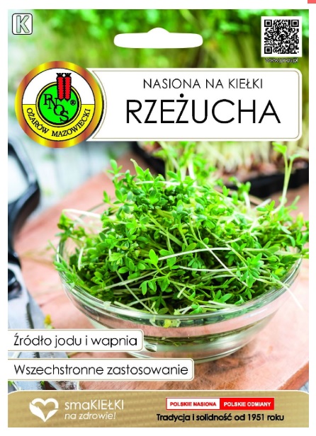 Nasiona na kiełki Rzeżucha. Wyjątkowo smaczne i aromatyczne kiełki. Pikantne i wyraziste w smaku. Doskonałe do jajek, sałatek, zup oraz serów. Bogactwo witamin: A, B1, B2, B3, B9, C, K i substancji mineralnych, zwłaszcza jodu, poza tym wapnia, żelaza, fosforu, cynku, manganu, magnezu i potasu. Zawierają także glukozynolany. Regulują przemianę materii. Wzmacniają włosy i paznokcie. Poprawiają cerę.