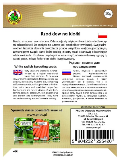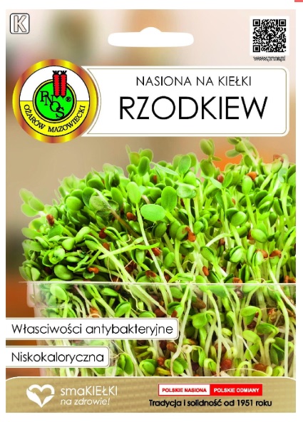 Nasiona na kiełki Rzodkiew. Bardzo smaczne i aromatyczne. Odznaczają się większymi wartościami odżywczymi od rzodkiewki. Swoje zdrowotne i lecznicze działanie zawdzięcza olejkom gorczycznym, zawierającym związki siarki, które nadają jej ostry smak. Rzodkiew bogata jest w witaminę C, a także witaminy z grupy B, wapń, potas, żelazo, fosfor oraz białka i węglowodany.