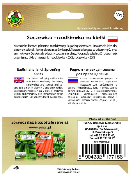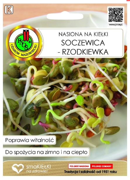 Nasiona na kiełki Soczewica-Rzodkiewka. Mieszanka łącząca pikantną rzodkiewkę z łagodną soczewicą. Doskonała jako dodatek do sałatek, kanapek oraz sosów i zup. Mieszanka bogata w witaminę C, oraz aminokwasy. Doskonały składnik codziennej diety. Poprawia witalność i odporność organizmu. Skład mieszanki: rzodkiewka – 50%, soczewica – 50%.