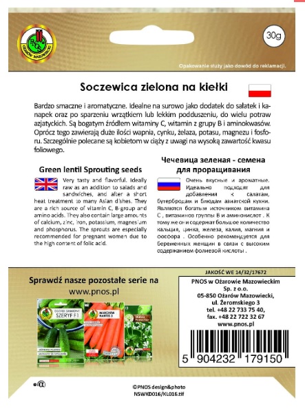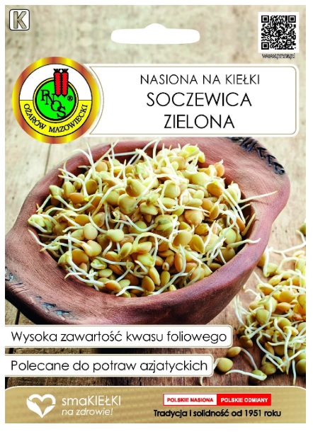 Nasiona na kiełki Soczewica zielona. Bardzo smaczne i aromatyczne. Idealne na surowo jako dodatek do sałatek i kanapek oraz po sparzeniu wrzątkiem lub lekkim podduszeniu, do wielu potraw azjatyckich. Bogate źródło witaminy C, witamin z grupy B i aminokwasów. Zawierają duże ilości wapnia, cynku, żelaza, potasu, magnezu i fosforu.