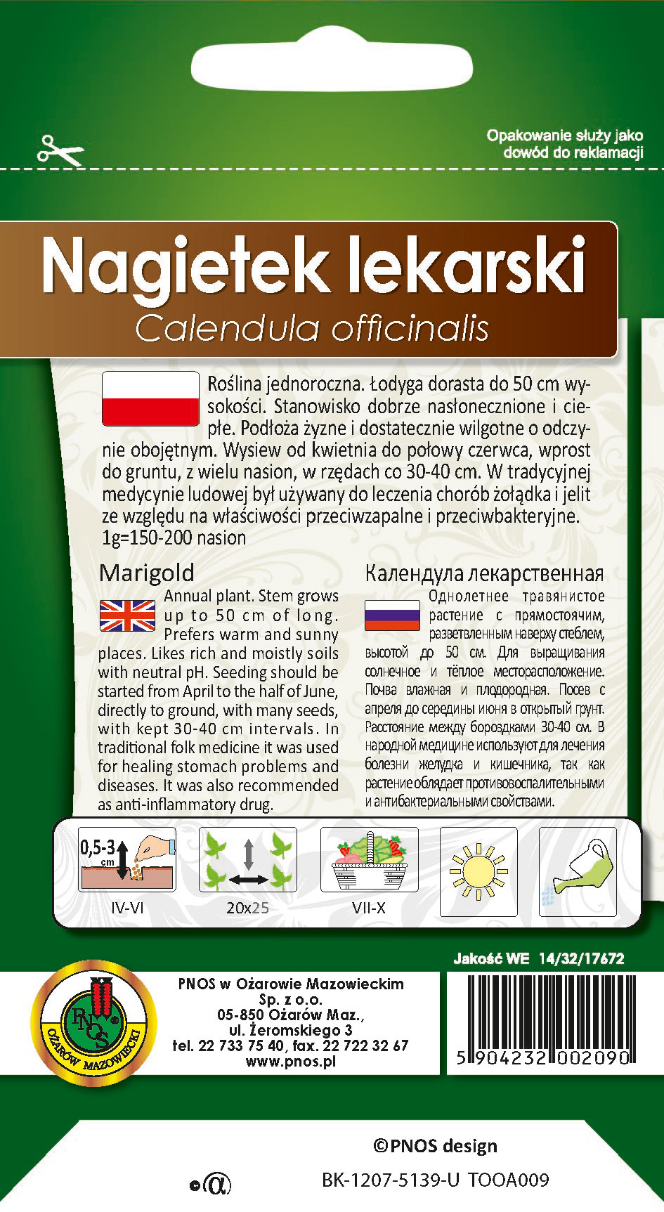 Nagietek lekarski to roślina jednoroczna. Rozgałęziona łodyga dorasta do 50 cm wysokości. Preferuje stanowisko dobrze nasłonecznione i ciepłe. Lubi podłoża żyzne i dostatecznie wilgotne o odczynie obojętnym. Wysiew od kwietnia do połowy czerwca, wprost do gruntu, z wielu nasion, w rzędach co 30-40 cm. W tradycyjnej medycynie ludowej był stosowane do leczenia chorób żołądka i jelit. Uznawano także, iż posiada właściwości przeciwzapalne i przeciwbakteryjne. Kwiaty nagietka lekarskiego zawierają m.in. saponiny, sterole, karetonoidy, związki śluzowe, kwasy organiczne, flawonoidy, witaminę C i sole mineralne (ze szczególnym uwzględnieniem magnezu).