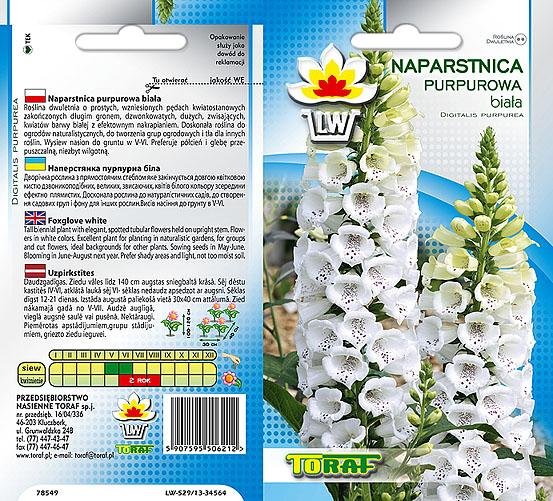 Roślina dwuletnia o prostych, wzniesionych pędach kwiatostanowych zakończonych długim gronem, dzwonkowatych, dużych, zwisających, kwiatów barwy białej z efektownym nakrapianiem.