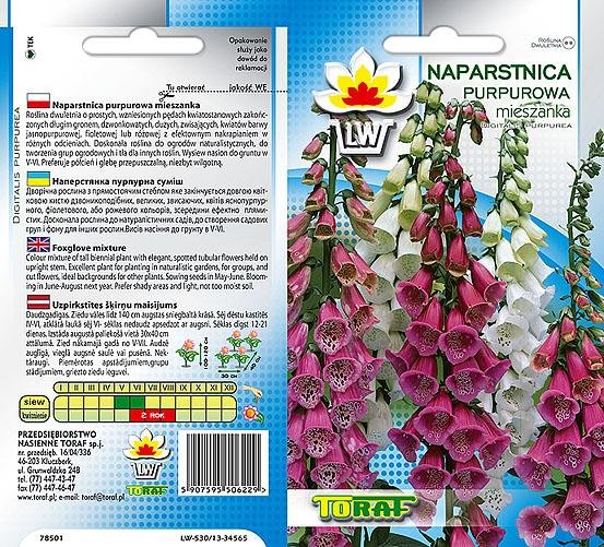 Roślina dwuletnia o prostych, wzniesionych pędach kwiatostanowych zakończonych długim gronem, dzwonkowatych, dużych, zwisających, kwiatów barwy jasnopurpurowej, fioletowej lub różowej z efektownym nakrapianiem w różnych odcieniach.