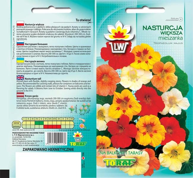 Roślina jednoroczna o giętkich, lekko płożących się pędach. Kwiaty w odcieniach pomarańczowego i żółtego. Polecana do okrywania murków, altan do pojemników na balkonach i tarasach. Kwiaty są jadalne i zawierają dużo witaminy C.