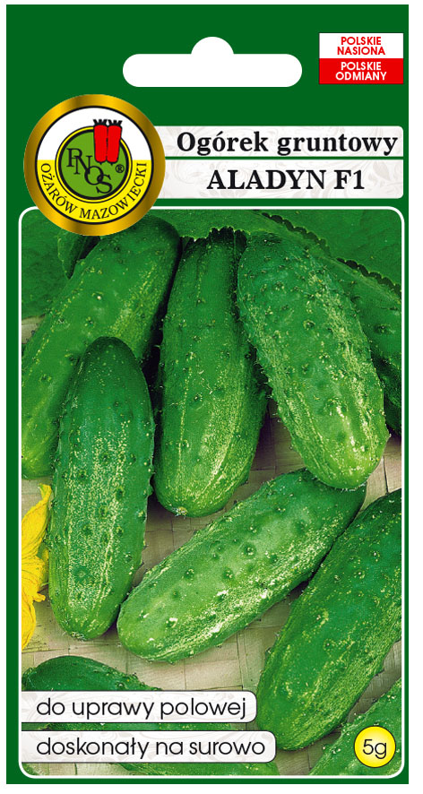 Ogórek Aladyn to odmiana średnio wczesna Ogórek gruntowy (do uprawy polowej), odmiana mieszańcowa, typowo konserwowa. Rośliny o ograniczonym wzroście. Owoce kształtne, krótkie, zielone z jasnymi smugami i małymi brodawkami. Owoce wyrównane w wielkości i kształcie. Bardzo plenna. Aladyn wyróżnia się kompleksową odpornością na choroby, w tym na mączniaka rzekomego. Nasiona drobne - pozwalają zmniejszyć normę wysiewu. Odmiana typowo konserwowa szczególnie przydatna do przetwórstwa. Preferuje glebę żyzną, próchniczą.