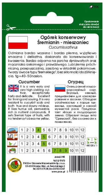 Ogórek Śremianin to odmiana wczesna. Mieszaniec F1. Bardzo wczesna i plenna odmiana. Przydatna zarówno do konserwowania jak i kwaszenia. Owoce typu śremskiego bez skłonności do żółknięcia, skórka zielona z lekkim połyskiem i smugami sięgającymi do połowy długości owocu. Śremianin jest odporny na parcha dyniowatych oraz posiada najwyższą tolerancję na mączniaka rzekomego i prawdziwego.