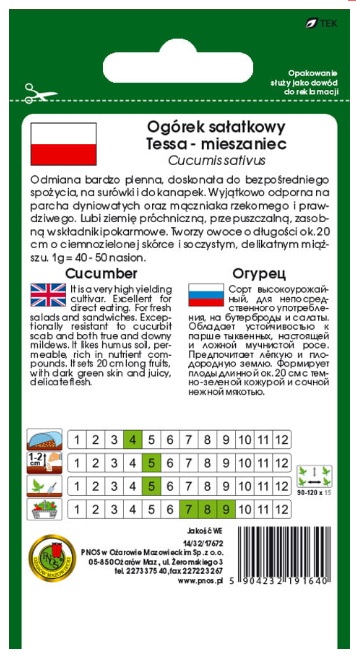 Ogórek Tessa to odmiana średnio wczesna. Odmiana sałatkowa do uprawy w polu. Owoce długości 18-22 cm o gładkiej, ciemnozielonej, błyszczącej, delikatnej skórce. Komora nasienna mała, miąższ gruby, soczysty bardzo delikatny, bez goryczy. Owoce nadają się (bez obierania skórki) do bezpośredniego spożycia, na sałatki, mizerię oraz na mrożonki. Rośliny wykazują wysoką tolerancją na mączniaka rzekomego, kanciastą plamistość i parcha dyniowatych. Nie wymagają zatem intensywnej ochrony chemicznej. Odmiana bardzo plenna, może być uprawiana pod niskimi osłonami.