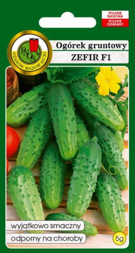 Ogórek Zefir F1 - gruntowy, o bardzo silnym wigorze (Cucumis sativus) to jedna z wcześniejszych odmian gruntowych ogórka. Jego głównymi zaletami jest niezwykle silny wigor oraz bardzo duża plenność. Zwłaszcza pierwszy zbiór jest bardzo obfity. Co ważne charakteryzuje się on dużą odpornością na choroby powszechne w uprawie ogórków, miedzy innymi na mączniaka rzekomego. Uzyskane owoce są bardzo kształtne, nie mają wyraźnej szyjki. Skórka przybiera intensywnie zielony kolor, jest błyszcząca z niewielkimi jaśniejszymi smugami. Na jej powierzchni widoczne są lekkie smugi i drobne brodawki. Wytwarzane przez niego owoce są nie tylko atrakcyjnie wizualnie, lecz również pod względem smaku. Kwaszone uzyskują najwyższe oceny podczas badań sensorycznych smaku kwaszeniaków.