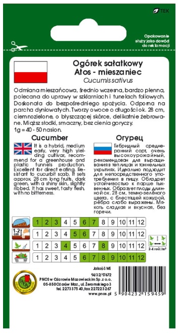 Ogórek Atos to odmiana średnio wczesna. Bardzo plenna. Przeznaczona do uprawy w szklarniach i tunelach foliowych. Doskonała do bezpośredniego spożycia. Owoce średniej długości (około 28cm), ciemnozielone o błyszczącej skórce, lekko żebrowane, pozbawione goryczy, kształtne. Miąższ smaczny, słodki. Odmiana odporna na parcha dyniowatych.