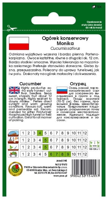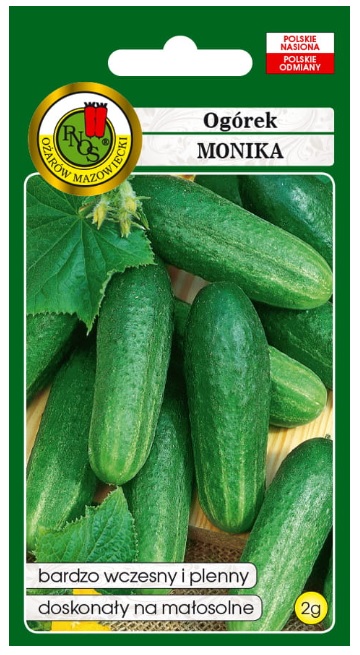 Ogórek Monika to odmiana bardzo wczesna. Plenna odmiana partenokarpiczna, do uprawy przyspieszonej w polu i pod folią. Rośliny o silnym wzroście, wytwarzają tylko kwiaty żeńskie. Owoce bardzo kształtne, wyrównane, krótkie (10-12 cm), bez szyjki, intensywnie zielone z wyraźnymi smugami, o szorstkiej powierzchni. Owoce nawet później zbierane nie żółkną. Odmiana sałatkowa nadająca się również do kwaszenia jako tzw. ogórek małosolny.