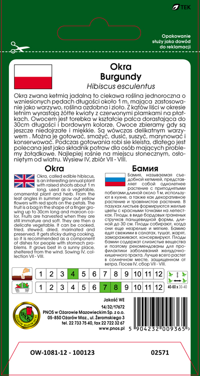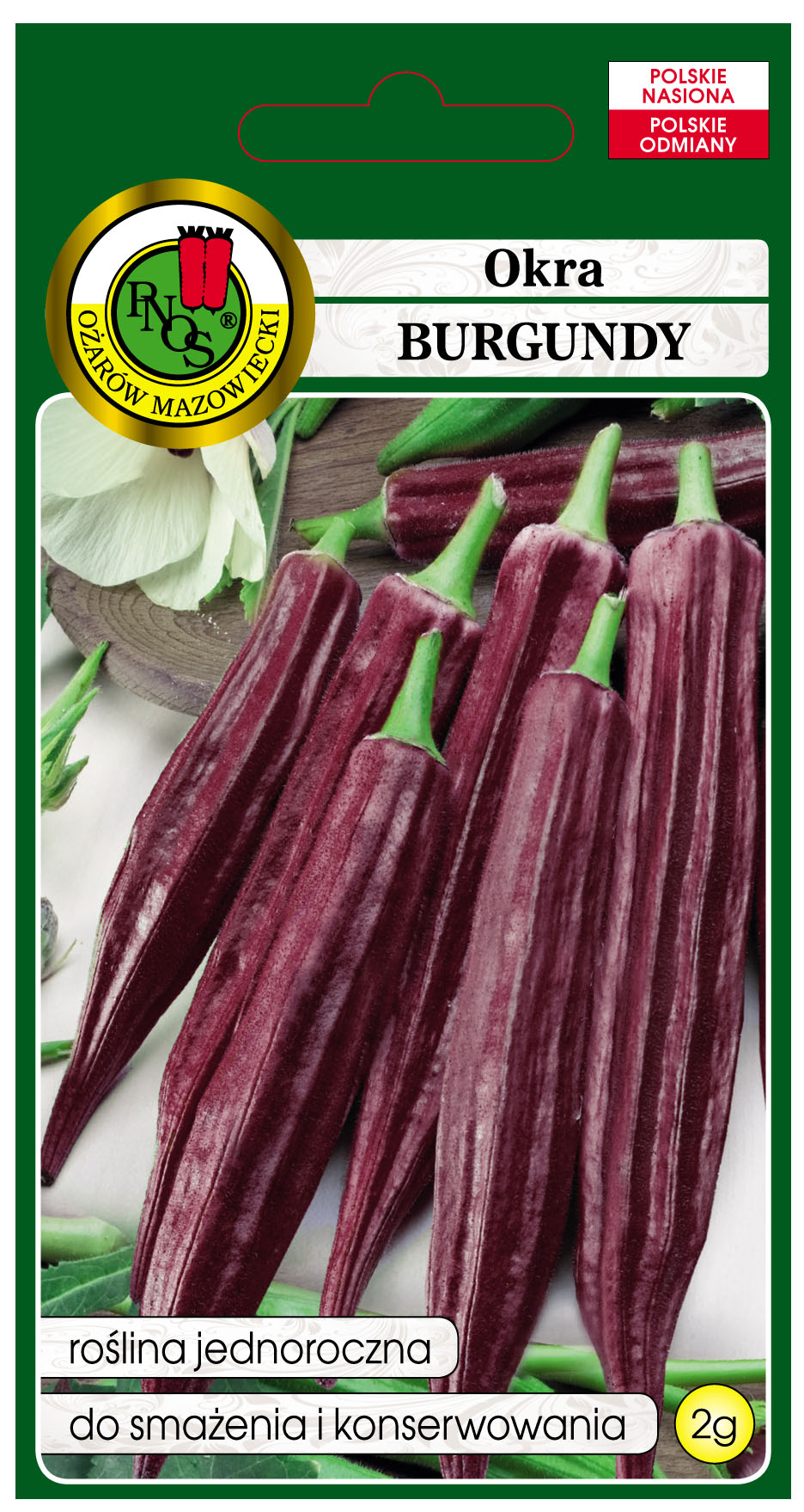Okra Burgundy zwana ketmią jadalną to ciekawa roślina jednoroczna o wzniesionych pędach długości około 1m., mająca zastosowanie jako warzywo, roślina ozdobna i zioło. Z kątów liści w okresie letnim wyrastają żółte kwiaty z czerwonymi plamkami na płatkach. Owocem jest torebka w kształcie palca dorastająca do 30cm długości, koloru bordowego. Owoce zbieramy gdy są jeszcze niedojrzałe i miękkie. Są wówczas delikatnym warzywem. Można je gotować, smażyć, dusić, suszyć, marynować i konserwować. Podczas gotowania robi się kleista, dlatego jest polecana jako składnik potraw dla osób mających problemy żołądkowe. Najlepiej rośnie na miejscu słonecznym, osłoniętym od wiatru. Wysiew w kwietniu, zbiór od lipca do sierpnia.