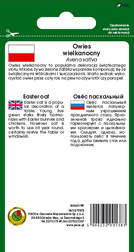 Owies Wielkanocny stanowi wspaniałą ozdobę wielkanocnego stołu. Około dwóch tygodni przed Świętami Wielkanocnymi należy wysiać nasiona do naczynia z ziemią i piaskiem lub ligniną czy watą. Na kiełki można wysiewać cały rok. Pilnować, aby podłoże w doniczce było stale wilgotne.