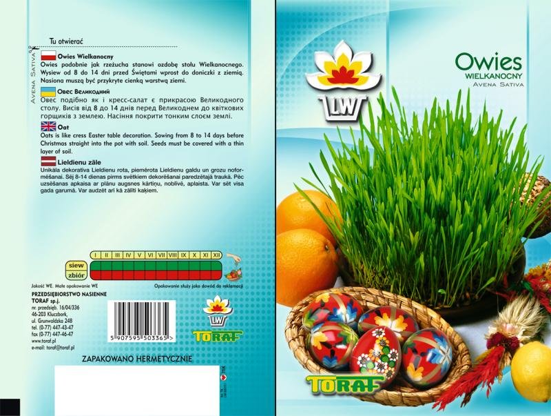 Owies podobnie jak rzeżucha stanowi ozdobę stołu Wielkanocnego. Wysiew od 8 do 14 dni przed Świętami wprost do doniczki z ziemią. Nasiona muszą być przykryte cienką warstwą ziemi.