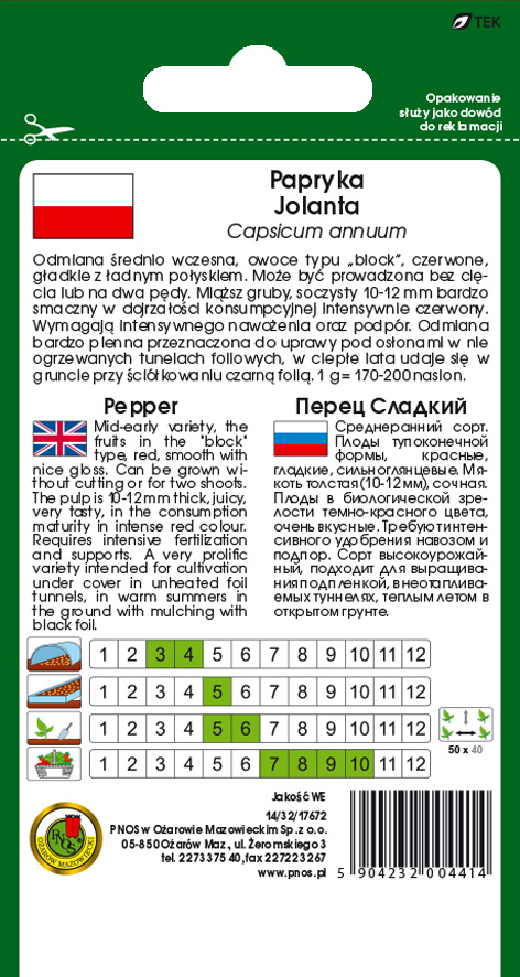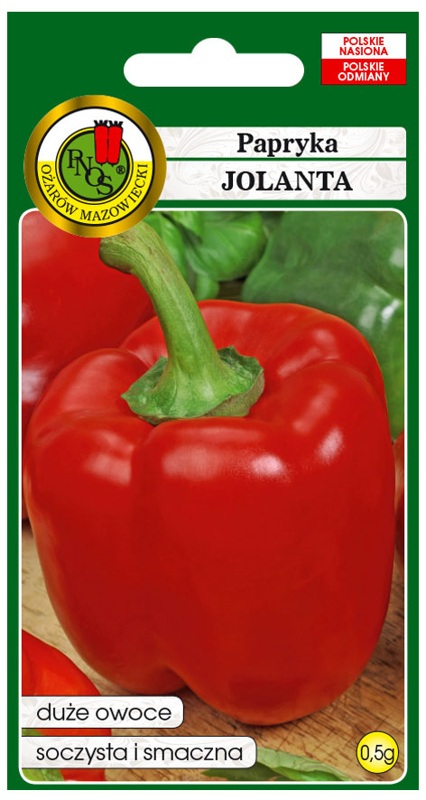 Papryka Jolanta czerwona to odmiana średnio wczesna. Owoce gładkie z połyskiem, typu block. Miąższ gruby, soczysty 10-12 mm, bardzo smaczny w dojrzałości konsumpcyjnej intensywnie czerwony. Rośliny osiągają około 85cm wysokości. Wymaga intensywnego nawożenia i podpór. Odmiana bardzo plenna przeznaczona do uprawy pod osłonami w nie ogrzewanych tunelach foliowych, w ciepłe lata udaje się w gruncie przy ściółkowaniu czarną folią. Polecana do bezpośredniego spożycia i przetwórstwa.