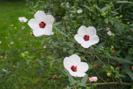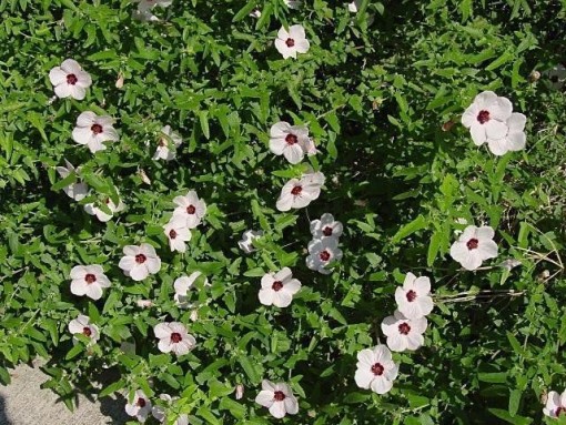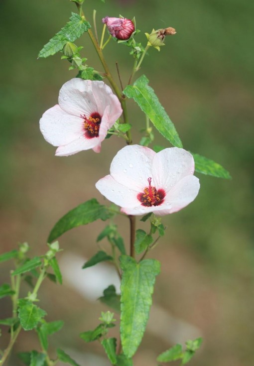 Pavonia hastata to mały zimozielony krzew o spiczastych liściach, trójkątnych na dole z ząbkowaną krawędzią, w ciemnym kolorze zielonym i o długości 5-6 cm. Kwiaty są często białe, czasem różowe, z zaznaczonym czerwonym lub bordowym środkiem, o średnicy około 5 cm.