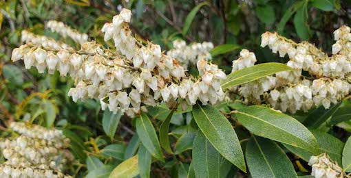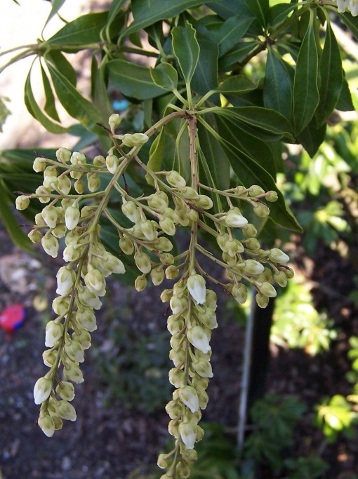 Pieris kwiecisty to zimozielony, wyprostowany krzew, który dorasta do około 1,2 m wysokości. Sztywne wyprostowane pędy, wybarwione na rdzawo, w młodości są owłosione. Ciemnozielone skórzaste liście, o długości od 3-8 cm, wyróżniają się eliptycznym kształtem. Pąki kwiatowe formowane są latem, dlatego kwiatostany można podziwiać jesienią. W przyszłym roku, w kwietniu i w maju, pojawiają się kwiaty. Na tle liści wspaniale prezentują się ich białe dzbaneczkowate kwiaty o długości około 8 mm. Kwiaty, ujęte w gęste wiechy, osiągające 12 cm długości i zdobią szczyty pędów.
