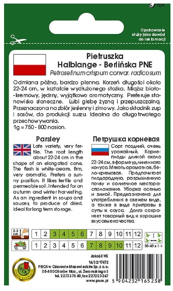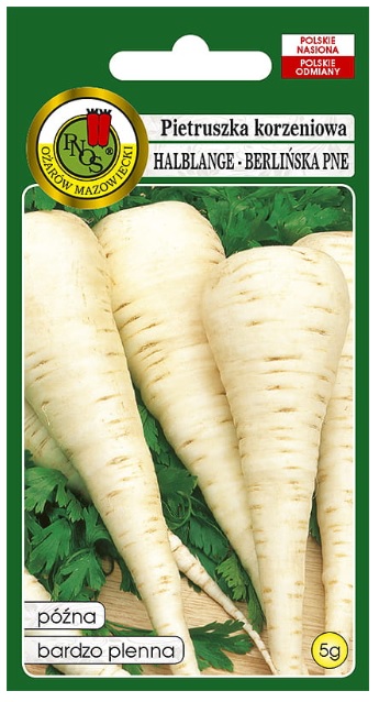 Pietruszka korzen Halblange berl. to bardzo plenna odmiana, przeznaczona na użytek jesienny i zimowy. Bardzo trwała w przechowywaniu. Korzeń długości około 20cm, w kształcie wydłużonego stożka, miąższ biały, jędrny. Wymaga gleby żyznej, pulchnej, zasobnej w próchnicę i dostatecznie wilgotnej. Wysiewać wczesną wiosną w rzędy co 30-40 cm. Po wschodach należy wykonać przerywkę, zostawiając rośliny co 3-4 cm.