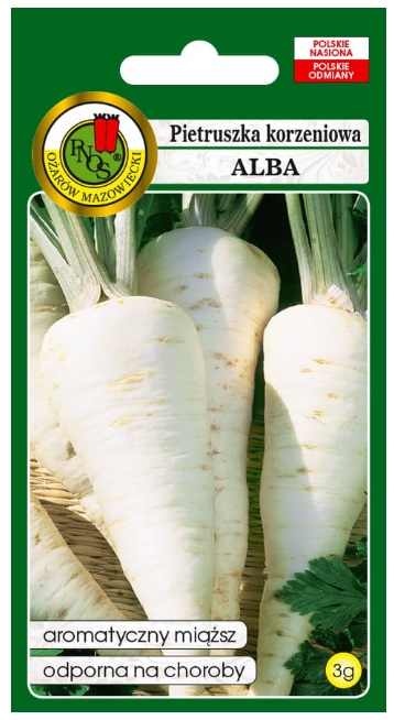 Pietruszka korzeniowa Alba to odmiana średnio późna. Przeznaczona do bezpośredniej konsumpcji, przetwórstwa i długotrwałego przechowywania. Korzenie długości 16-18cm, w kształcie wydłużonego stożka, odporne na brunatnienie. Miąższ aromatyczny, biały, nieciemniejący (liście zdrowe), bardzo mocne. Odporna na choroby atakujące pietruszkę w trakcie przechowywania. Na glebach ciężkich lepiej uprawiać ją na redlinach.